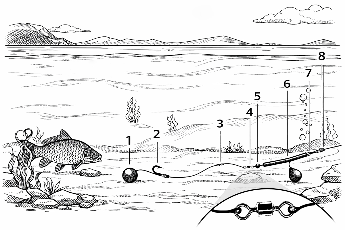 Zwischen Wirbel und Hauptschnur (8) können anschließend beispielsweise eine Perle (5), ein Anti-Tangle-Boom mit Blei (6) sowie ein Gummistopper (7) montiert werden. Diese Montagekomponenten sorgen dafür, dass sich die Hauptschnur nicht mit der Montage verwickelt, sondern gerade zum Grund herab absinkt.